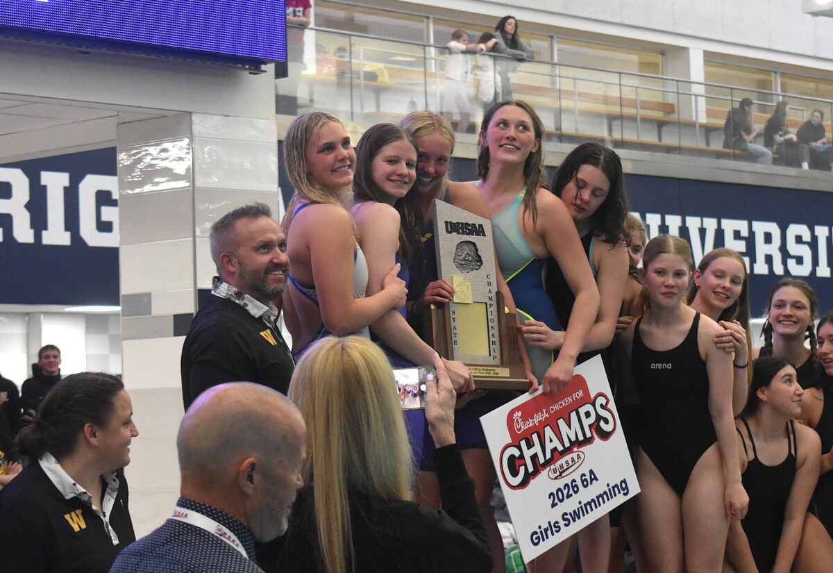 - The Wasatch girls swim team poses for photos after winning the 6A state championship team title at the BYU Pool on Saturday, Feb. 21, 2026.