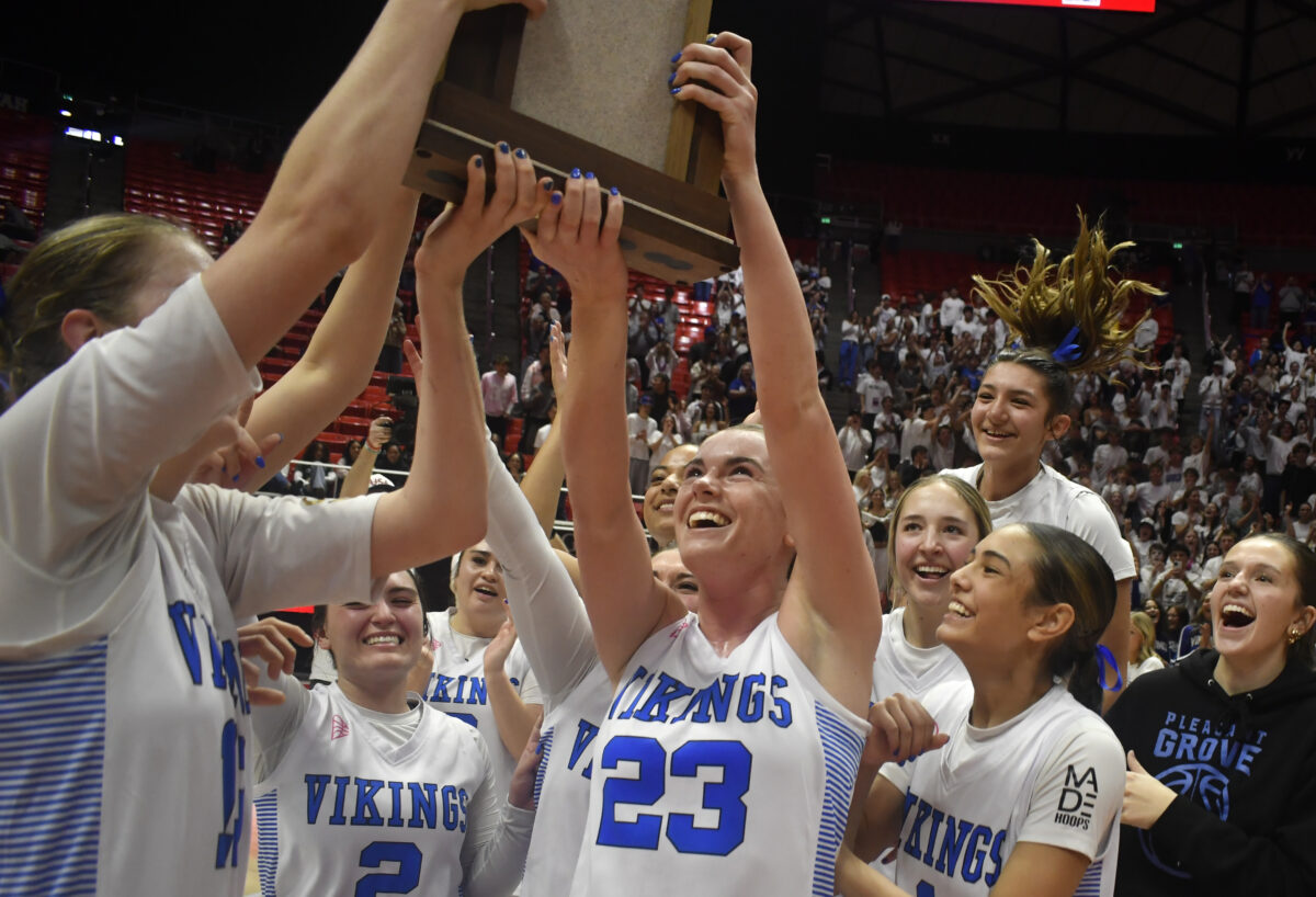 - The Pleasant Grove girls basketball team celebrates winning the 5A state championship at the Huntsman Center in Salt Lake City on Friday, Feb. 27, 2026.