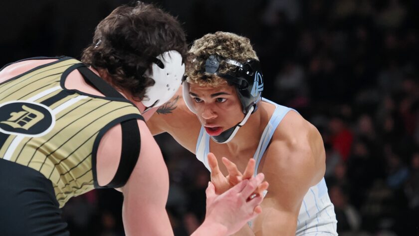 Westlake's Kaizen Detoles (right) battles Ryker Roundy of Davis in the 6A boys wrestling state finals at the UCCU Center on Thursday, Feb. 12, 2026.2026 All-Valley Boys Wrestling