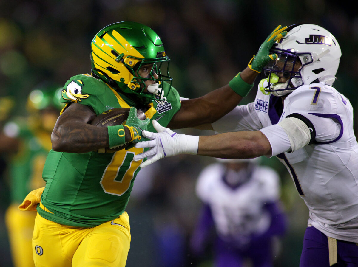 - Oregon running back Jordon Davison (0) stiff arms James Madison defensive back Jacob Thomas (7) during the first half of the first round of the NCAA College Football Playoff, Saturday, Dec. 20, 2025, in Eugene, Ore.