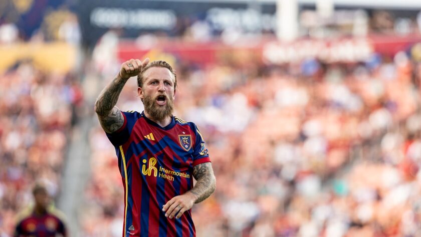 Real Salt Lake forward Johnny Russell celebrates scoring a goal against DC United at America First Field on Saturday, June 14, 2025.SANDY — Johnny Russell scored his first goal of the season, 18-year-old Zavier Gozo also scored a goal and Real Salt Lake beat D.C. United 2-0 on Saturday night to snap their seven-game winless streak.