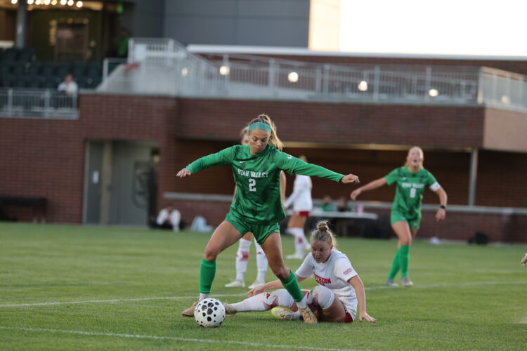 Utah Valley's Faith Webber (2) takes the ball away from a Southern Utah player in a women's college soccer match at UCCU Stadium on Thursday, Oct. 23, 2025.Utah Valley graduate forward Faith Webber has been named to the TopDrawerSoccer All-America Second Team, the organization announced following the conclusion of the 2025 women’s college soccer season.