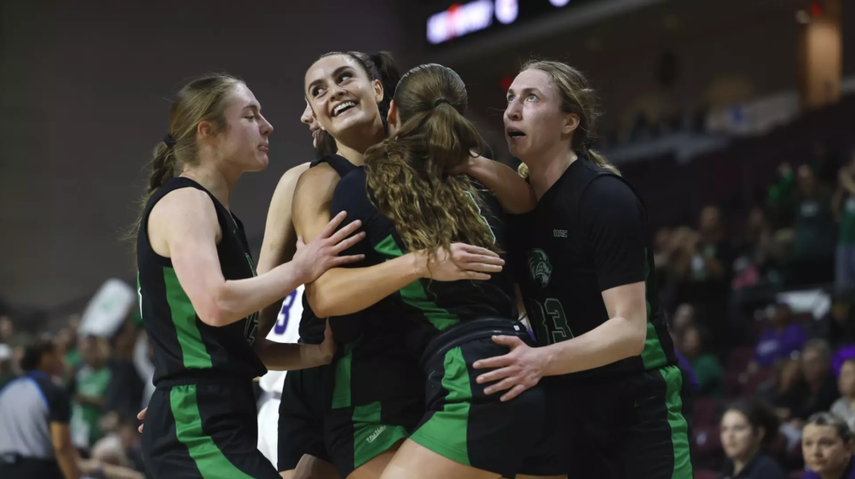 - UVU players celebrate with senior Tahlia White (center) after a big play during the WAC quarterfinal game against Abilene Christian at the Orleans Arena in Las Vegas on Thursday, March 13, 2025.