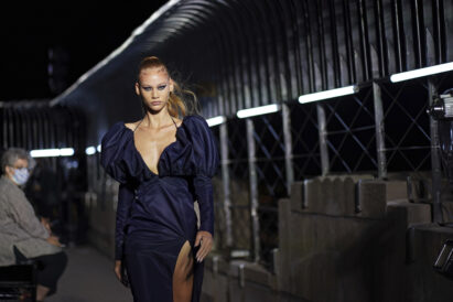 There were looks in barely there black lace, tiny bra tops paired with trousers and full skirts, and body hugging slinky dresses with cut outs from neck to calf. As Marina sang from a platform at the end of the runway, models of all sizes also walked in classic evening looks in black and white, including one-shoulder dresses with a single long sleeve and a slice of bared midriff. Other looks were adorned with vertical rows of feathers.