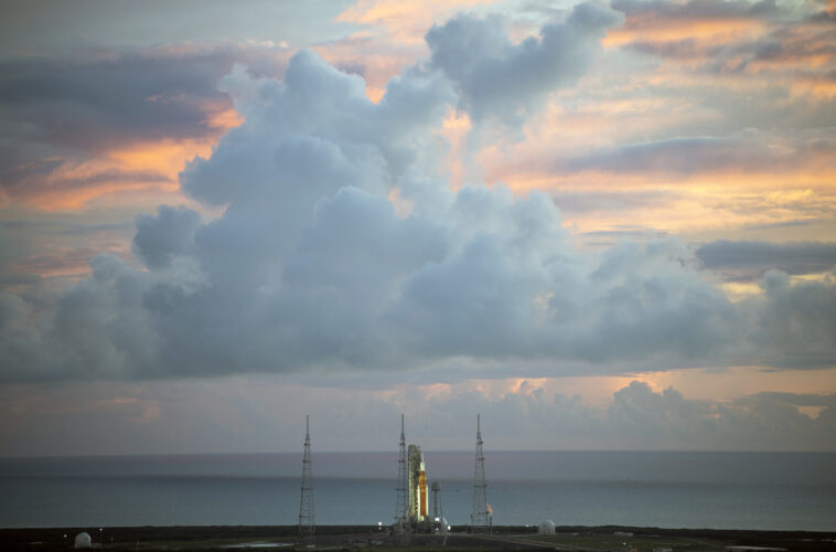 The NASA moon rocket stands ready at sunrise on Pad 39B before the Artemis 1 mission to orbit the moon at the Kennedy Space Center, Monday, Aug. 29, 2022, in Cape Canaveral, Fla. (Joel Kowsky/NASA via AP)