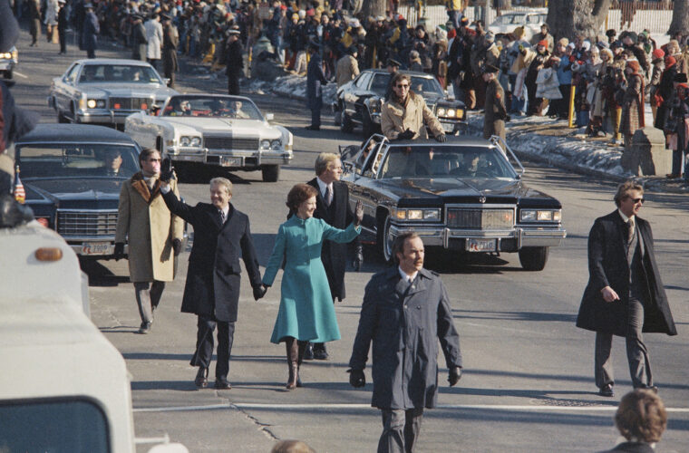 FILE - President Jimmy Carter and first lady Rosalynn Carter walk down Pennsylvania Avenue after Carter was sworn in as the nation's 39th president, Jan. 20, 1977, in Washington. (AP Photo, File)