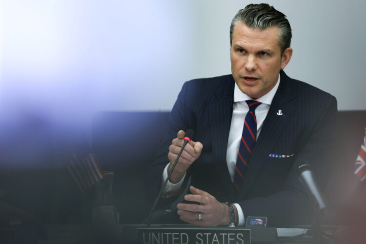 United States Secretary of Defense Pete Hegseth speaks during a meeting of the Ukraine Defense Contact group at NATO headquarters in Brussels, Wednesday, Feb. 12, 2025. (AP Photo/Omar Havana)