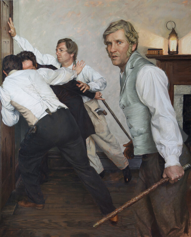 Using those photos and loads of historical research, Childs recently supervised construction of a set in Provo replicating the interior of Carthage Jail. On Dec. 1, men in mid-19th-century dress with painted faces and period weapons stormed the set so that Childs could collect photos in preparation for the second panel of a diptych (or set of two paintings that are thematically or conceptually linked) depicting the last moments before the mob forced its way into the room where Smith was being held with brother Hyrum Smith and friends Willard Richards and John Taylor.