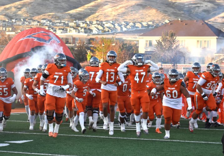 The Skyridge football team takes the field for a 6A state football quarterfinal game against Pleasant Grove on Friday, Nov. 3, 2023.SKYRIDGE FALCONS