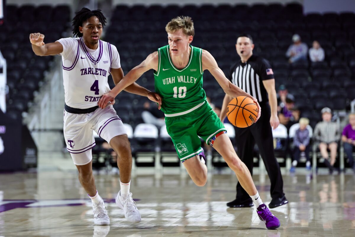 - Utah Valley’s Trevon Leonhardt (10) dribbles against Tarleton State in a WAC men’s college basketball game in Stephensville, Texas, on Thursday, Jan. 1, 2026.