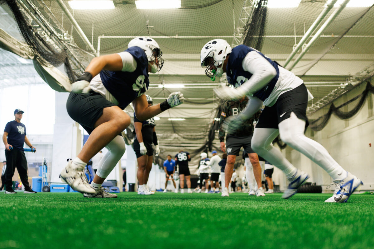 BYU linemen go through drills during one session of spring practices. March 6, 2026
